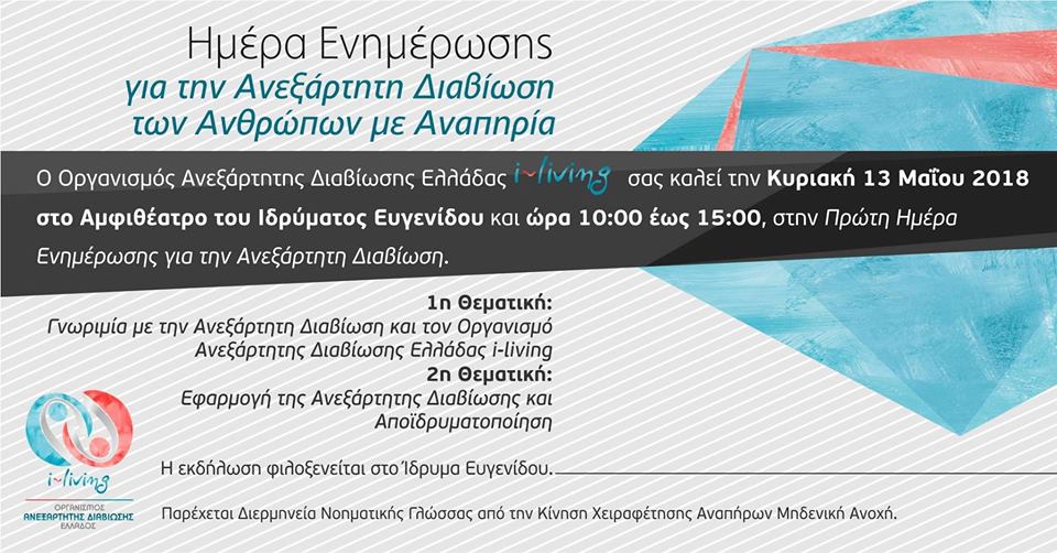 Ο Οργανισμός Ανεξάρτητης Διαβίωσης Ελλάδος - i-living (Indipendent Living Organization of Greece) διοργανώνει ημέρα ενημέρωσης σχετικά με όλα τα παραπάνω, δίνοντας απαντήσεις που αφορούν στο κοινωνικό σύνολο κι όχι μόνο στα άτομα με αναπηρίες.